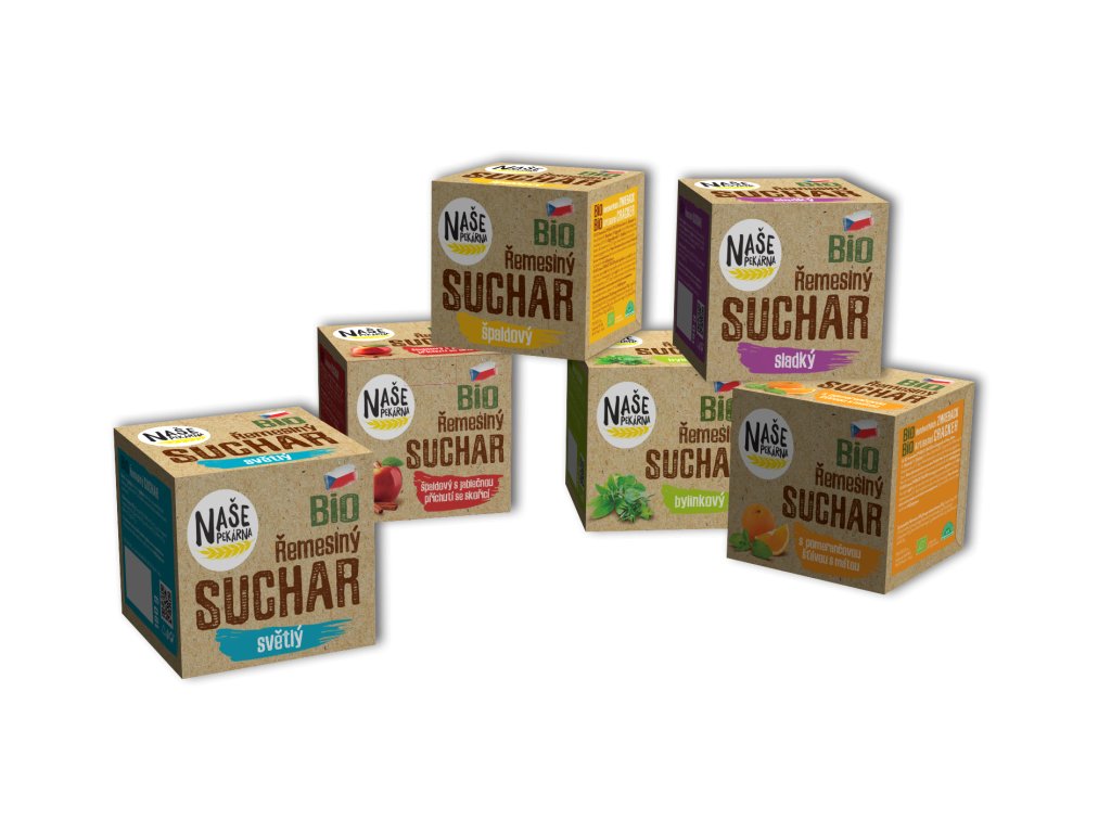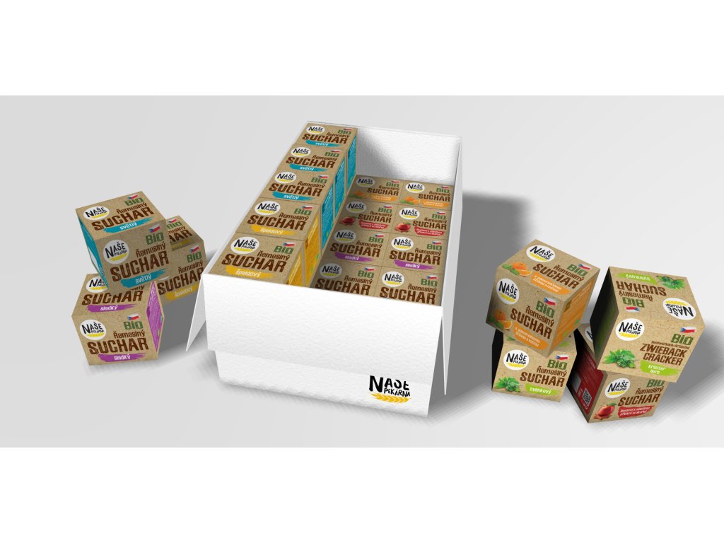 Počet dnů trvanlivosti: 240. Hmotnost 1 krabičky: 180g. Mix světlých, špaldových, sladkých sucharů a sucharů s ovocnými, či bylinkovými příchutěmi. Křehké a křupavé. Bio řemeslné suchary z ekologického hospodářství. Vhodné ke snídani nebo jako lehká svačinka.Možné koupit mix velkého balení po 30 ks, nebo i jednotlivě po 15, či 30 kusech.